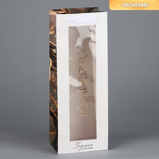 Пакет подарочный под бутылку, упаковка, «Поздравляю», мрамор, 36 х 13 х 10 см