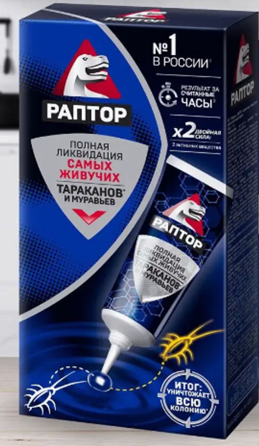 Гель от тараканов и муравьев Раптор, 75 мл. Эффект действия геля РАПТОР основан на том, что насекомое, съедая гель или контактируя с ним, становится носителем отравляющего вещества. Активное вещество действует постепенно. Таким образом, насекомое успевает вернуться в популяцию, где погибает само и заражает еще нескольких своих собратьев. Уникальная консистенция приманки позволяет ей дольше удерживать влагу и, соответственно, дольше оставаться привлекательной для насекомых. Lambda-cyhalothrin (лямбда-цигалотрин) - пиретроидный инсектицид, эффективен против широкого спектра вредителей. Обеспечивает быстрое уничтожение вредителей (гибель не менее чем через 24 часа после обработки поверхности). Обладает контактным, кишечным и остаточным действием, а также отпугивающими свойствами.- защита от тараканов- Средство от муравьев- гель от тараканов- защита от муравьев- гель от муравьев- Средство против насекомых- средство против тараканов- для борьбы с муравьями- для борьбы с тараканами