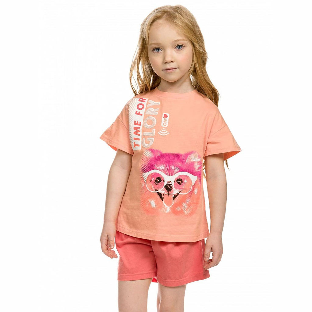 Комплект для девочек: футболка и шорты. Новая модель футболки! А - образный силуэт, короткие рукава расширены книзу, спущенное мягкое плечо, принт с блестящей "сахарной" посыпкой, перевод принта "Время славы". Шорты с защипами по переду и внутренней регулировкой объема.