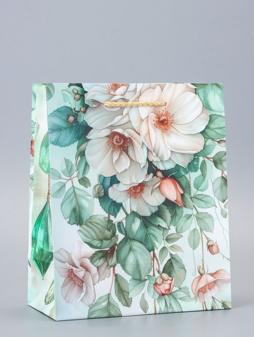 Подарочный пакет Цветочный рай это ламинированная упаковка среднего размера с сочным зеленым фоном и богатым ботаническим принтом. Он создает ощущение природной гармонии и жизненной энергии, делая подарок визуально выразительным.
