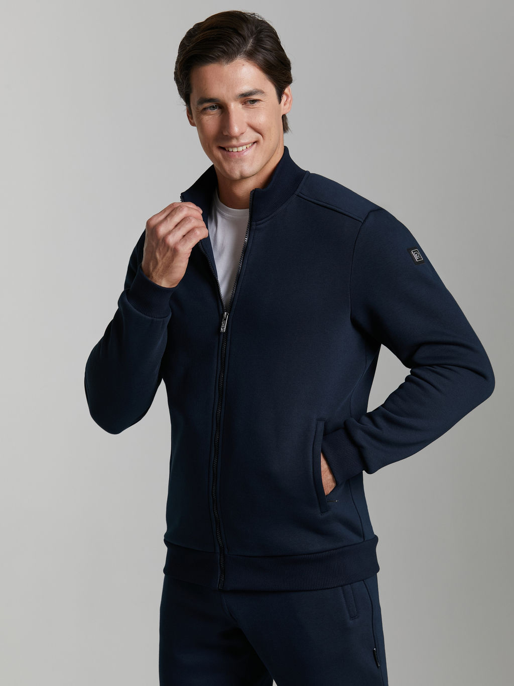 Тип материала: футер трехниточный с начесом ? Футер трехниточный с начесом мягкое плотное трикотажное полотно с высоким изнаночным начесом. Состав полотна 65% хлопка, 35% полиэстера. Изделия из этого полотна обладают высокими теплозащитными свойствами, очень удобны как для повседневной носки, так и для занятия спортом в холодное время года. Изделия из трехниточного футера очень хороши для детской одежды, сочетая теплоту и мягкость с хорошей воздухопроницаемостью и легкостью, не требуют особенного ухода, износостойкие. Мужской артикул 12M-RR-1830 темно-синего цвета спортивный спортивный костюм из хлопкового трикотажного полотна с изнаночным начесом. Костюм состоит из удобной куртки на поясе, с воротником-стойкой, куртка застегивается на молнию. Рукава втачные. На рукаве слева настрочен фирменный шеврон с металлическим логотипом. Пояс, воротник и манжеты куртки изготовлены из эластичного полотна. Карманы куртки и брюк застегиваются на молнии. Брюки прямого силуэта, слегка заужены книзу. Пояс брюк по линии талии с эластичной резинкой, дополнительно регулируется шнуром. Костюм создан для комфортного отдыха и тренировок в прохладное время года.