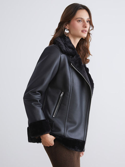 • K?rkl? Yaka Kad?n Deri G?r?n?ml? Mont