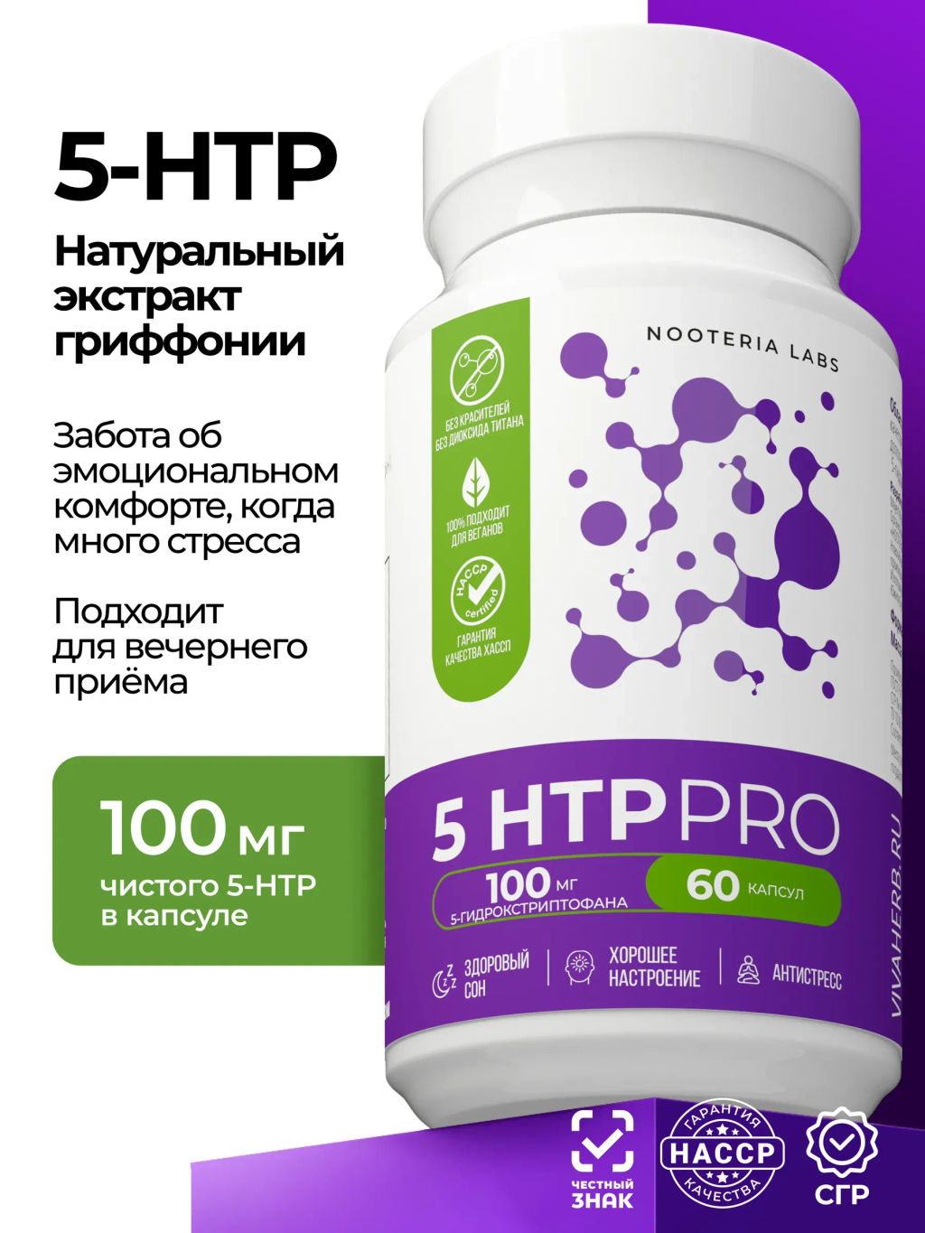 5HTP от компании Nooteria Labs — это вытяжка без примесей из Гриффонии, мягкая поддержка нервной системы. На фоне курса приема этой добавки может даже уходить лишний вес, так как снижается тяга к сладкому, а еще улучшится качество сна.