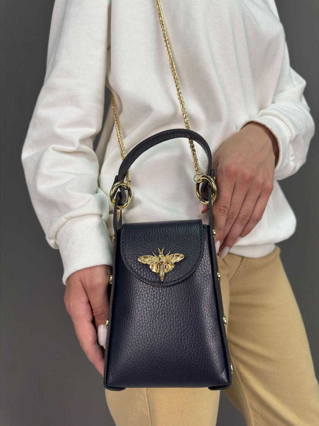 Страна: Италия Акции: Товары со скидкой Производитель: Pelletteria Luisa, Italy Размер: маленькая Стиль ношения: на ремешке через плечо Форма: жесткая Выделка кожи: зернистая износостойкая Цвет кожи: Синий Оттенок: темно-синий Упаковка: Пакет тканевый L, 40x40 см Палитра цветов: TB-105944 Dollaro Размеры: длина: 13 см \tвысота: 21 см \tширина: 6 см Описание: Красивая аккуратная необыкновенно модная женская сумка кросс-боди из натуральной кожи. Италия. Особенности сумки: замок в виде золотой бабочки, плечевой ремень-цепочка, а также заклепки на боковых стенках сумки - фурнитура высокого итальянского качества. Все эти элементы непременно привлекут к вам внимание окружающих своей яркостью и оригинальностью исполнения. Сумочка имеет каркасную форму, компактная, выполнена из зернистой телячьей кожи, может использоваться как повседневная модель, но подойдет и для торжественного случая - элегантно дополнит вечерний образ по типу клатча, либо подчеркнет сдержанный лук. Закрывается сумка на крышку, внутри один отдел, в котором поместится всё самое необходимое. На дне сумки металлические защитные ножки. Можно носить в руке, либо на изящной цепочке через плечо - очень удобно!