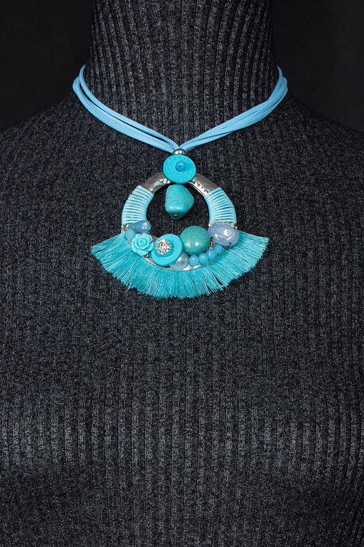 Этот изумительный подвес - модная стилизация этнического стиля. Замшевый шнурок, металл серебрянного цвета. Голубой и бирюзовый цвета.