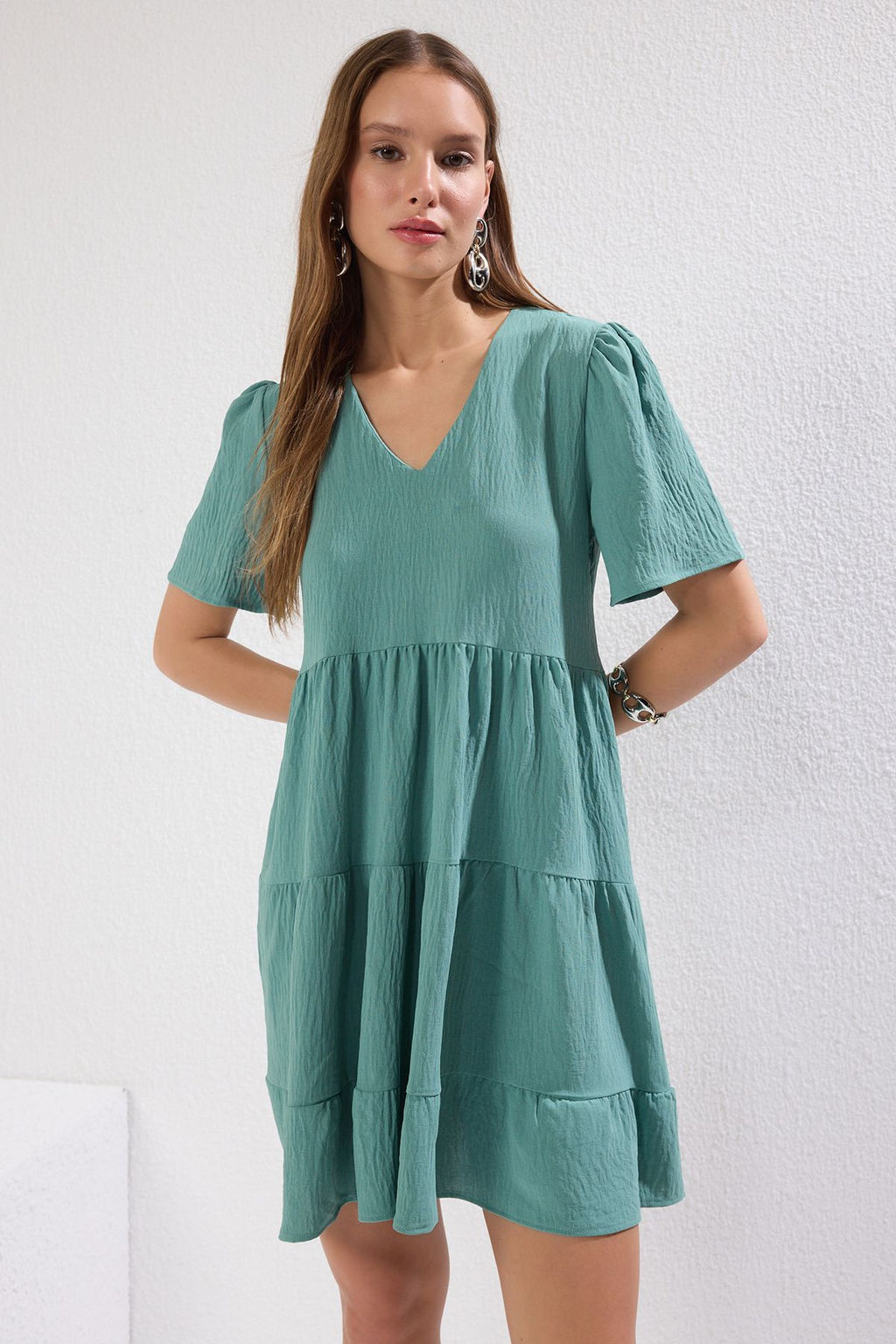 Haki Genis Kesim V Yaka Mini Dokuma Elbise TWOSS20EL0400