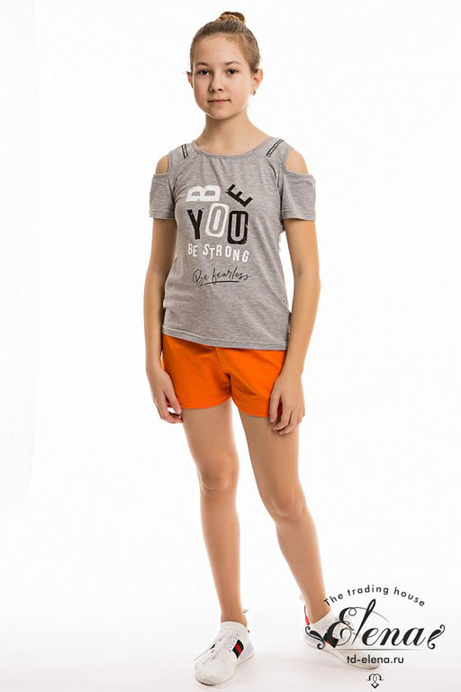 Летний костюм для девочек состоит из шорт и футболки. Футболка выполнена из однотонной кулирки с лайкрой. Рукава короткие, украшены декоративной тесьмой, плечевая часть открытая. Спереди на футболке нанесён принт. Шорты из футера с лайкрой, пояс на резине и шнуре. Сзади, с левой стороны накладной карман.