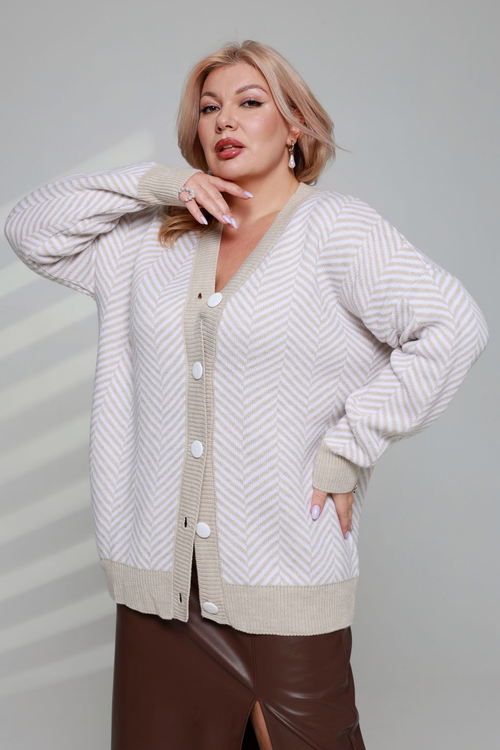 Кардиган, выполненный из высококачественного трикотажа - идеальное решение для стильных и модных женщин, которые стремятся выглядеть привлекательно и комфортно в любое время года. Благодаря уникальной технологии вязки, кардиган обладает удивительной мягкостью и легкостью, позволяя коже дышать. Глубокий V-образный вырез переходит в планку с пуговками. Кардиган можно носить как открытым, так и застегнутым на пуговицы это позволяет создавать различные стильные сочетания. Манжеты на рукавах полной длины и  низ изделия связаны в технике английской резинки. Благодаря своему универсальному дизайну, этот кардиган идеально сочетается с любыми нарядами - от повседневных до вечерних.  Безупречный стиль этого изделия подчеркнет вашу индивидуальность и придаст образу шарма и элегантности.­