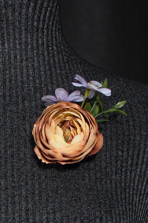 Аксессуар в виде букетика цветов отличный способ привлечь внимание к вашему образу! С брошью в виде пиона из ткани и пластика Вы не останетесь незамеченной!Коричневый и желтые оттенки.
