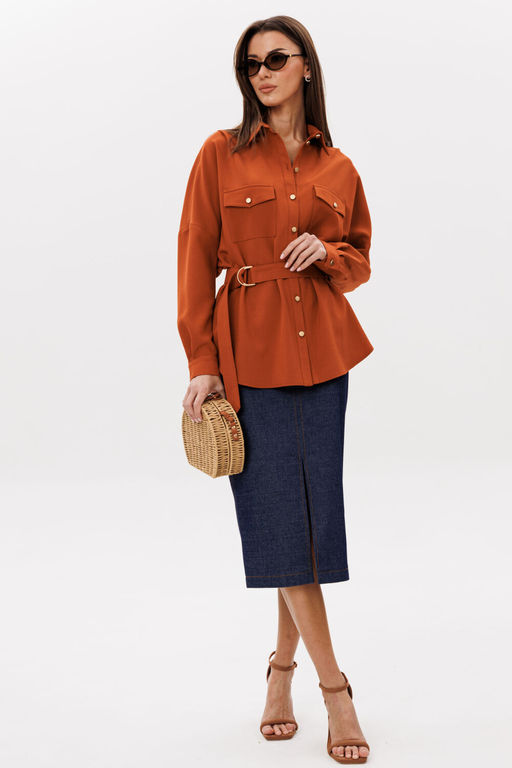 Состав: Блуза: Вискоза-30%; ПЭ-68%; Эластан-2%; Юбка: ПЭ-26%; Хлопок-72%; Эластан-2%; Потрясающий элегантный юбочный комплект, в котором каждая девушка будет себя ощущать королевой! Блузон-рубашка стиля оверсайз прямого силуэта с рубашечным воротником на стойке и зауженным рукавом на манжете, со спущенной линией плеча. Спереди на функциональной планке петли-пуговицы. На линии груди расположены два кармана с клапаном на пуговице. Спинка изделия имеет горизонтальную плечевую кокетку и встречную складку для свободы облегания. По плечевому шву заложена складка. Низ блузона слегка фигурный: спинка и полочка чуть длиннее бокового шва. Длина изделия блузона по спинке 72 см в размерах 44-48, в размерах 50-52 длина изделия на 3 см больше. Длина спущенного плечевого шва 32 см. Длина рукава с манжетой 40 см. Юбка-миди облегающего силуэта на обтачном поясе. На линии талии переднего и заднего полотнища расположены вытачки. Спереди вертикальный шов с открытым разрезом. Высота разреза 30 см. В среднем шве заднего полотнища находится застежка - потайная молния 18 см. Боковые и фронтальный шов юбки имеют джинсовую отделочную строчку. Длина юбки 73 см. Представленная фурнитура может отличаться от представленной на фото/видео материале. Особые рекомендации: рекомендуется холодная деликатная ручная стирка, без использования отбеливающих СМС, без интенсивного трения. Сушка в вертикальном положении. ВТО с минимальным паром. -- Характеристики -- Состав: Блуза- Вискоза-30%; ПЭ-68%; Эластан-2%; Юбка- ПЭ-26%; Хлопок-72%; Эластан-2%; Сезон: Лето Рост: 164 Страна бренда: Беларусь