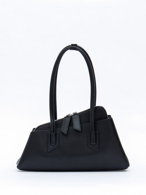 Эффектная сумка ассиметричной формы, выполнена из кожи. Дополнена серебристой фурнитурой. Данная модель закрывается на молнию, носится в руке или на плече за встроенные ручки. На ручках имеется фиксатор. Каркас полужесткий.