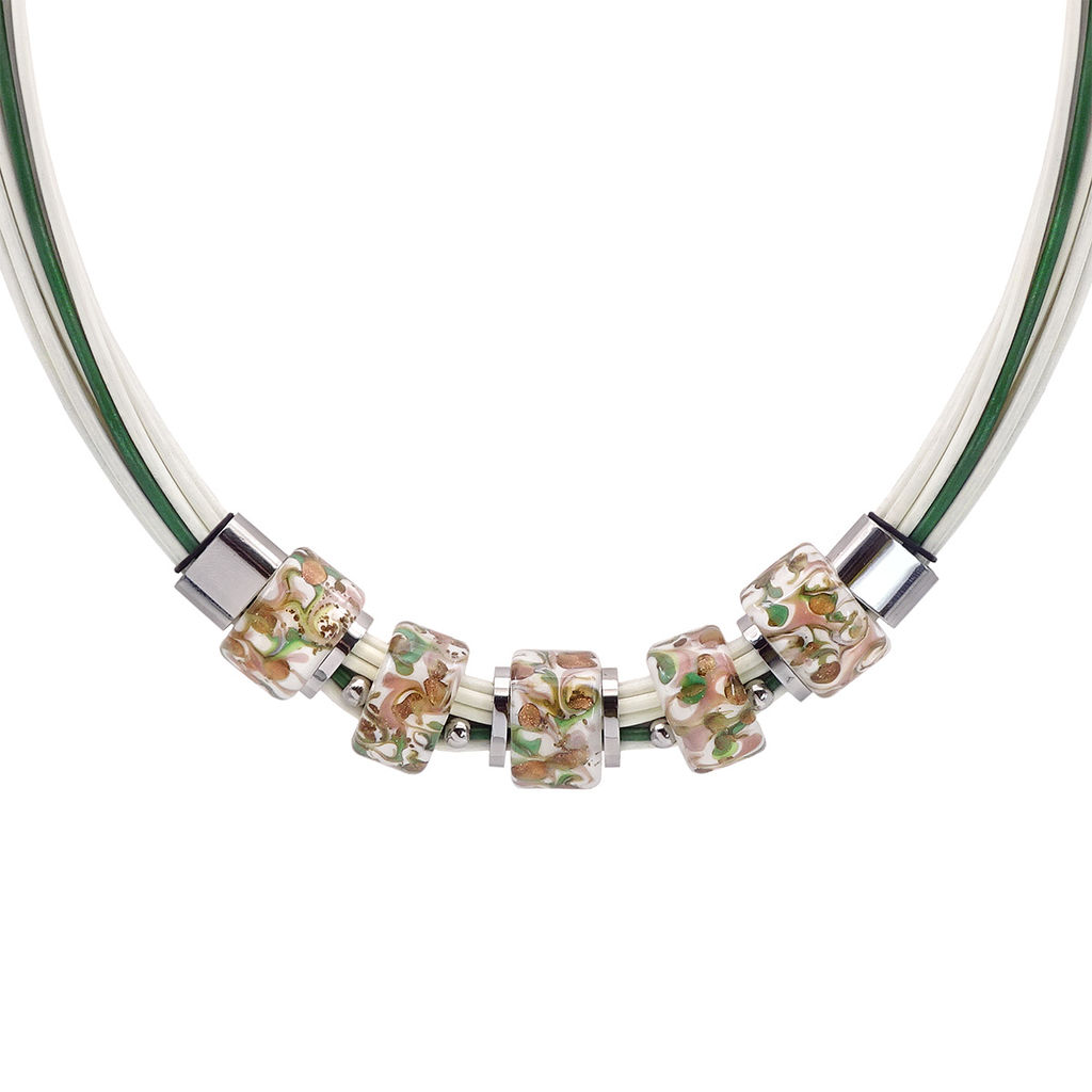 Колье изготовлено из натуральной кожи, муранского стекла и гипоаллергенной ювелирной стали, что очень важно для людей с чувствительной кожей. Металл не темнеет и не подвергается воздействиям окружающей среды, надолго обеспечивая красивый внешний вид изделия. Длина колье - 43 см + 5 см. удлиняющая цепочка.  Размер стеклянных бусин - 1,9х1,3 и 1,9х1 см. Вес - 52 гр.