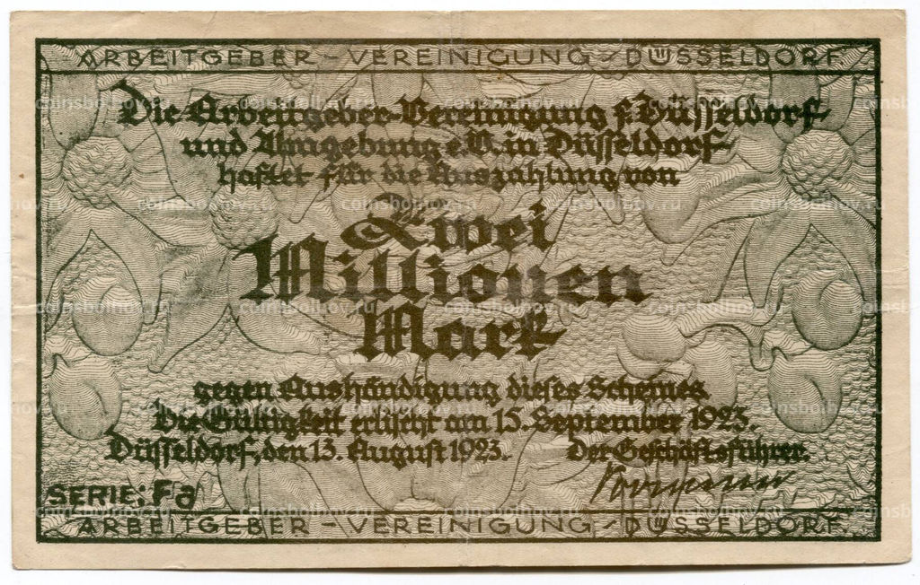 Банкнота 2000000 марок 1923 года Германия Нотгельд (Дюссельдорф)