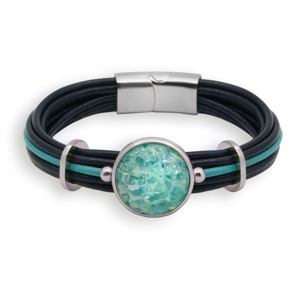 Браслет изготовлен из муранского стекла, натуральной кожи и гипоаллергенной ювелирной стали, что очень важно для людей с чувствительной кожей. Металл не темнеет и не подвергается воздействиям окружающей среды, надолго обеспечивая красивый внешний вид изделия. Крепкий магнитный замок с двойной защитой надежно фиксируется на запястье. Ширина браслета - 1,5 см. Диаметр стеклянного элемента - 2 см. Вес - 23 гр.