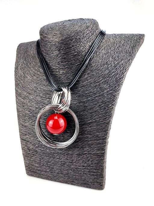 Ожерелье на шнуре черного цвета из экокожи с подвеской из колец разного размера.