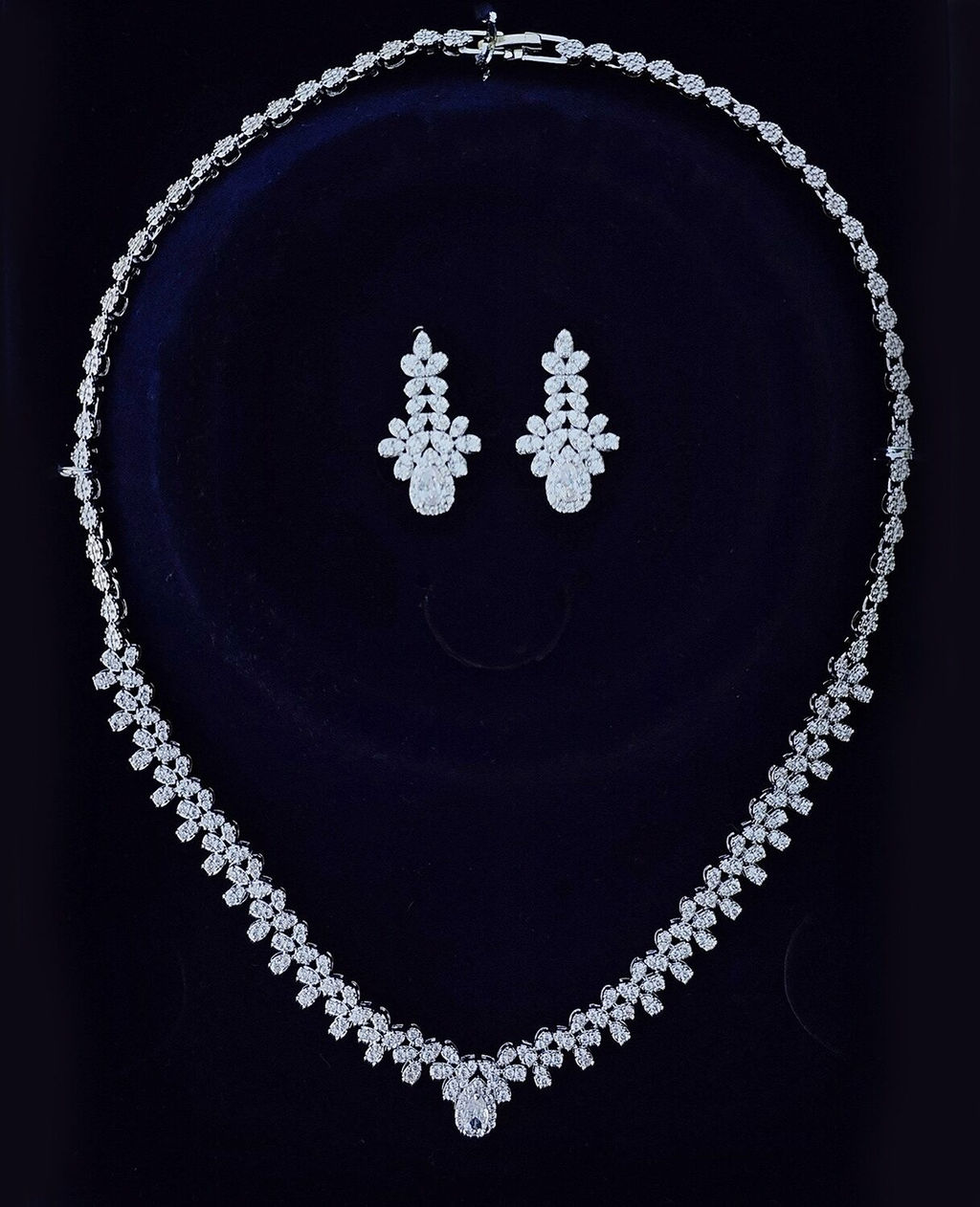 Изготовлен из ювелирного сплава покрытого родием. Металл не тускнеет и не стирается со временем. Изделие гипоаллергенно . Длина - 45 см. Длина серег - 2,5 см.­