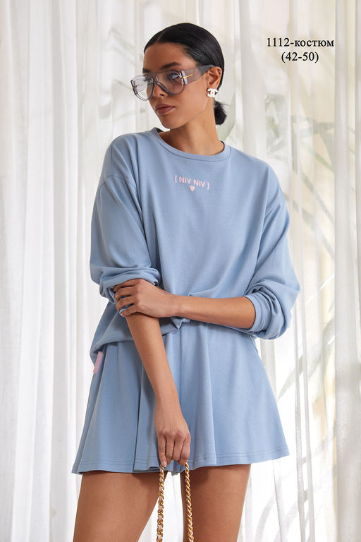 Оригинальный джемпер свободного силуэта, выполнен из плотного премиального трикотажного полотна. Спущенная линия плеча. Рукав длинный , на притачной манжете. Спина прямая. Горловина круглая, с притачной планкой. Авторский принт на полочке изделия. Юбка - шорты на резинке. Карманы в боковых швах. В кармане шорт брендированный флажок.