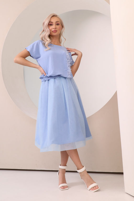 Очаровательный джемпер полуприлегающего силуэта из текстильной ткани голубого цвета. Круглый вырез изделия обработан внутренней бейкой. Джемпер с цельнокроеными рукавами. Перед изделия дополнен декоративной тесьмой "перья". По низу изделия манжет с резинкой. Длина изделия по спинке от плечевого шва до низа изделия 54 см. Рост фотомодели 170 см.