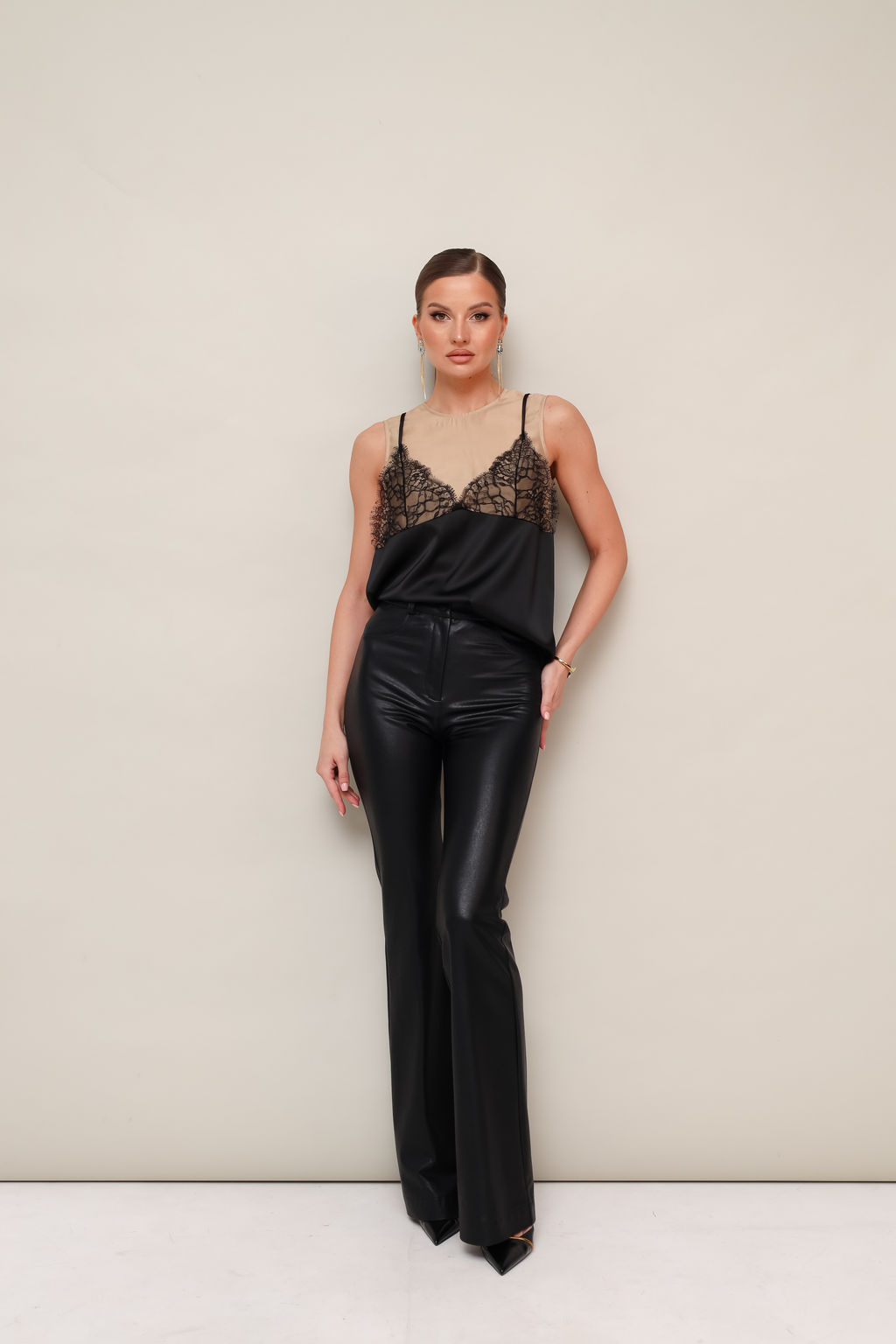 Элегантная блузка прямого силуэта в бельевом стиле. Блузка с округлым вырезом горловины, спереди выполнена имитация чашки из французского кружева на бретельках. Спинка с застёжкой в разрезе на навесную петлю и пуговицу. Блузка создает основу для вечерних и повседневных образов в вашем гардеробе.