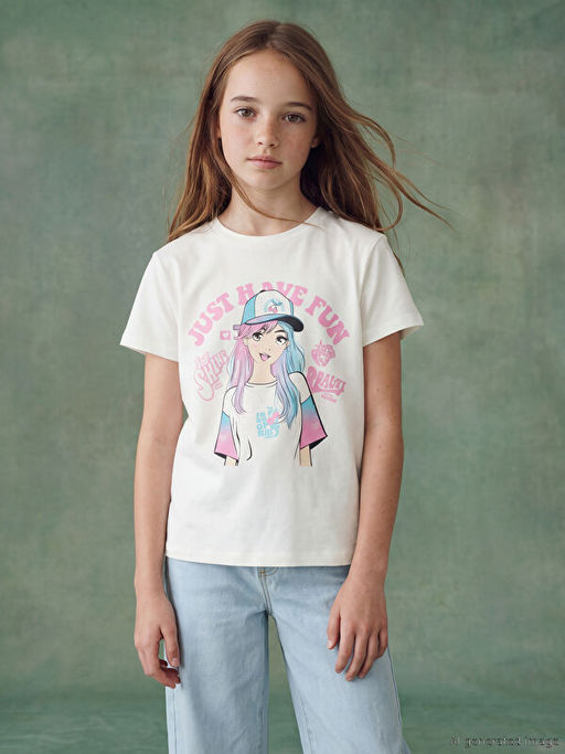 Bisiklet Yaka Bask?l? K?z ?ocuk Ti??rt