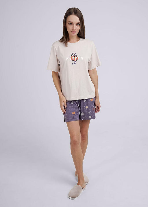 Футболка прямого силуэта из прочного, износостойкого хлопкового полотна. Мягкая ткань приятна на ощупь и не вызывает раздражения. Футболка для дома с круглым вырезом горловины и втачным рукавом комфортно сидит на любой фигуре, не теряет форму и яркость даже после множества стирок. Спереди изделие украшено принтом. Стильная модель идеально подходит в качестве домашней одежды, гарантирует комфорт и практичность. Состав: 100% хлопок