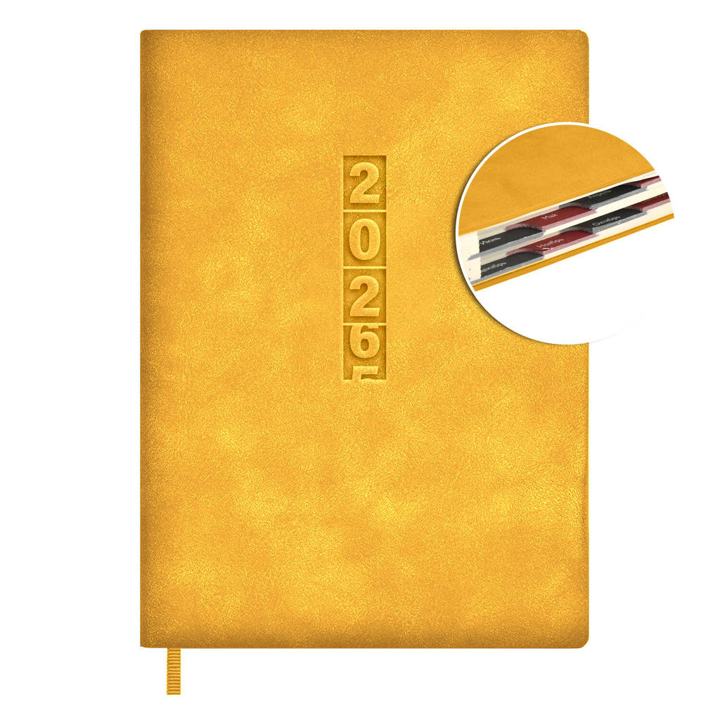 Ежедневник датированный 2026 ESCALADA, #ДУМАЙ КАК МИЛЛИАРДЕР, А6+, 176 л., арт. 70300/ 20 ТИВОЛИ ГЛОСС ГОРЧИЧНЫЙ (кожзам: 126х174 мм, мягкий переплёт, запаянный край, материал обложки: искусственная кожа "Тиволи глосс"; декор: блинтовое тиснение; способ крепления блока: ниткошвейный; вн. блок: 176 л., кремовый офсет 70 г/м?, печать в две краски (линия), справочный материал: есть; перфорация углов блока: есть; закладка/-и: одно ляссе; каптал: есть; форзац: печать пантоном; особенности: в блоке использованы мотивирующие высказывания из книги "Думай как миллиардер", помогающие сформировать правильное отношение к финансам, профессиональной деятельности, своим способностям и к жизни в целом, вырубка блока по месяцам; персонализация возможна: да; индивидуальная упаковка: промостикер + ПЭТ-пакет)