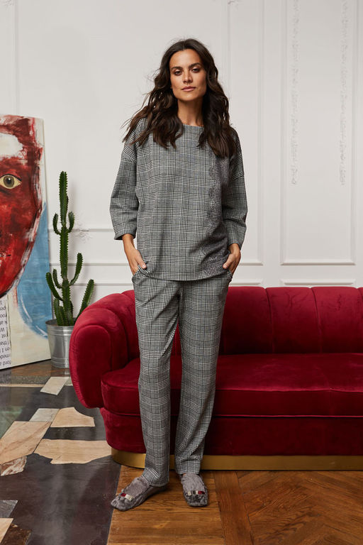 Удобные домашние брючки выполнена из смесовой ткани черно-белого цвета с модным принтом "гусиная лапка". Модель прямого кроя. Комфортный пояс дополнен мягкой резинкой. По бокам брюк расположены глубокие карманы. Приятная ткань комфортна в носке. Отличная модель для домашнего отдыха.­
