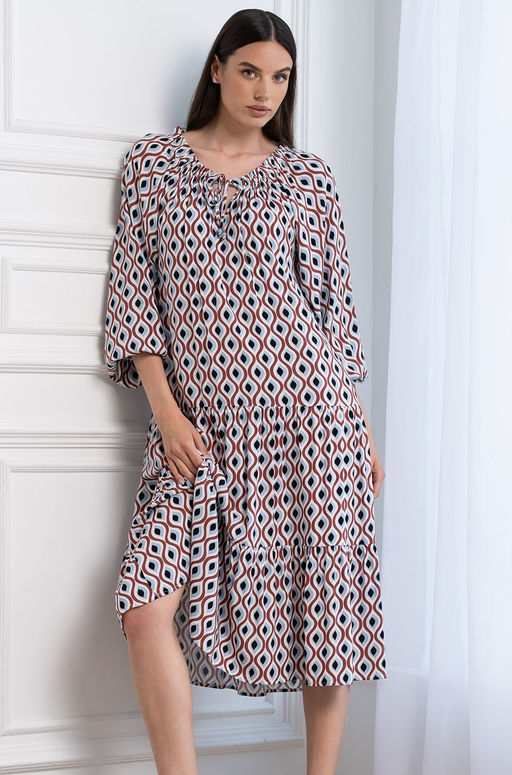 Туника Mia-Amore с рядами сосборенных воланов и рукавами-реглан, сосборенными на резинку по низу. Круглая горловина модели декорирована завязкой. Туника выполнена из принтованного вискозного полотна. Состав:100% вискоза