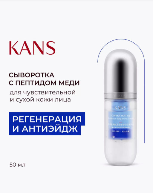 Описание товара Сыворотка для лица KANS (КАНС) с пептидом меди из серии Синяя капсула Cooper Peptide Firming &Repairing Serum концентрированное водно-кремовое средство для комплексного восстановления, омоложения и увлажнения чувствительной, возрастной кожи с недостатком влаги и потерей упругости. ТИП КОЖИ: подходит для чувствительной, хрупкой, обезвоженной и склонной к сухости коже. Встраивается в цикл ежедневного ухода за кожей после очищения и перед нанесением крема. Эффективно подтягивает, разглаживает и уплотняет кожу, напитывает влагой и успокаивает эпидермис, устраняет покраснения, шелушения и восстанавливает защитные функции кожи от негативных факторов окружающей среды. Нежная, кремообразная текстура сыворотки легко наносится и распределяется, быстро впитывается и комфортно увлажняет кожу, не оставляя липкости или жирности. Имеет едва ощутимым косметический аромат и роскошный сапфировый оттенок, не окрашивающий кожу. Синий медный пептид способствует синтезу коллагена, уменьшению воспалений и заживлению ран. Растительный сквалан и масло Ши восстанавливают гидролипидную мантию, способствуют усилению барьерных функций кожи и удержанию влаги. Запатентованный омолаживающий ингредиент Tiracle Pro стимулирует процессы самоочищения и обновления клеток кожи: обеспечивает выведение свободных радикалов и воспалительных стрессовых факторов из клеток кожи, регулирует работу водных каналов, обеспечивая доставку влаги в обезвоженные слои кожи и её закрепление. Аргирелин (ацетилгексапептид-8) действует подобно ботулотоксину: расслабляет мимические мышцы, помогает разгладить динамические морщины, заломы, зажимы и предотвращает образование новых складок на коже. Регулярное применение сыворотки для лица KANS (КАНС) с синим пептидом меди Cooper Peptide Firming помогает наиболее эффективно восстановить барьерные функции кожи, снять раздражения, шелушения и сухость кожи, сделать её более мягкой, упругой и плотной, подтянуть овал лица.