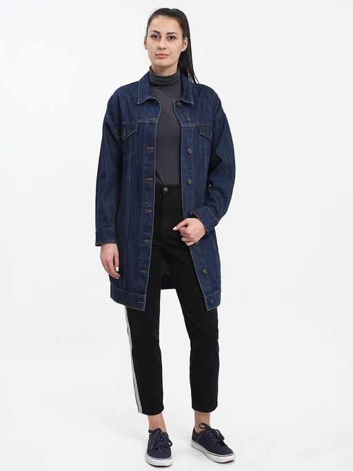 Женская удлиненная  джинсовая куртка свободного покроя  в стиле oversize. Свободная пройма и рукава обеспечивают комфорт и не сковывают движения; по низу рукавов  манжеты, застегивающиеся на пуговицу; небольшой воротник; на груди карманы с клапаном, также застегивающимся на пуговицу; функциональные боковые прорезные карманы "в листочку"; на поясе по бокам куртки хлястик и две пуговицы, которые позволяют регулировать длину обхвата по поясу. Выполнены из ткани denim. Классическая темная  стирка.