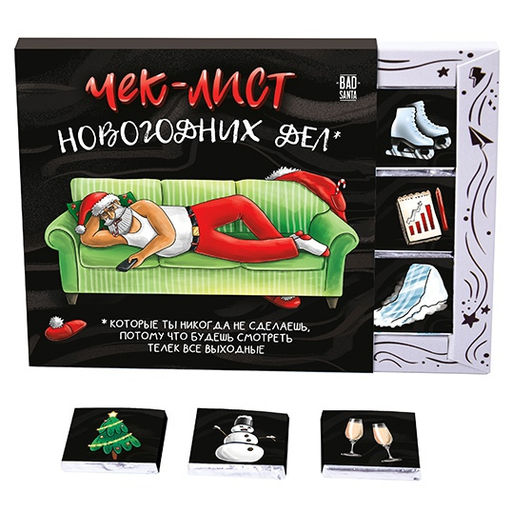 Внутри 9 плиток молочного шоколада  Состав : сахар, какао масло, сухое цельное молоко, какао тертое, эмульгатор соевый лецитин, натуральный ароматизатор ваниль.   Вес 45 г   Каждый год строишь кучу планов на праздничные каникулы. А потом лежишь дома? Тогда этот подарок для тебя. Лежи и ешь шоколад.  Мы кладём внутрь наших презентов вкуснейший молочный шоколад из бельгийского сырья: 36,8% какао. В коробке 9 шоколадок по 5 граммов каждая. Все конфеты завёрнуты в индивидуальную упаковку с дизайном и душевными или дерзкими надписями (зависит от тематики подарка). Общая коробка герметично упакована.  Это оригинальный подарок для друзей и коллег с чувством юмора. Он точно не будет пылиться на полке, потому что шоколад и сарказм любят миллионы людей. Последние несколько лет дерзкие подарки находятся в тренде и бьют все рекорды по продажам. Ведь эффект от такого презента это веселье.