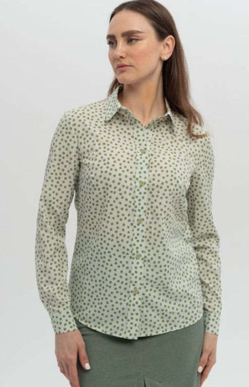 Женская рубашка с длинным рукавом приталенного силуэта. Застежка расположена спереди и закрепляется на пуговицы. Рукав данной модели на манжете и закреплен также пуговицей. Элегантная рубашка, прекрасно сочетается с брюками и юбками, любого формата - от классического офисного до повседневного