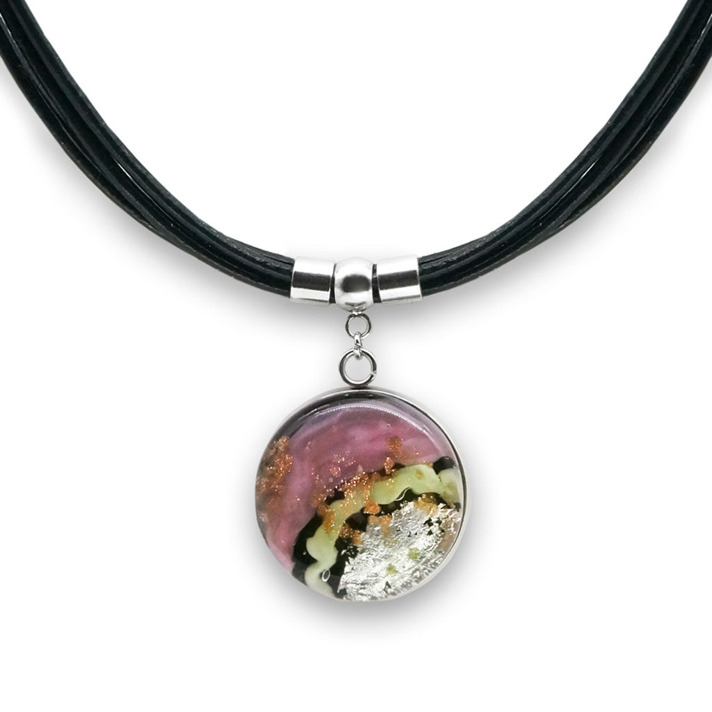 Колье изготовлено из натуральной кожи, муранского стекла и гипоаллергенной ювелирной стали, что очень важно для людей с чувствительной кожей. Металл не темнеет и не подвергается воздействиям окружающей среды, надолго обеспечивая красивый внешний вид изделия. Длина колье - 46 см + 5 см. удлиняющая цепочка. Диаметр стеклянного элемента - 2,5 см. Вес - 19 гр.­