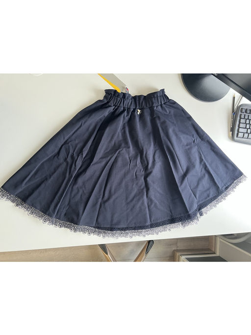 Юбка полусолнце из трикотажа на притачном поясе с эластичной тесьмой. Верх пояса декорирован оборкой, низ юбки украшен настрочным ажурным кружевом. Состав:92% хлопок, 8% лайкра