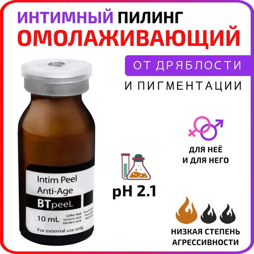• Интимный пилинг омолаживающий с феруловой, фитиновой, кофейной и глюконовой кислотой, общий процент кислот: 20%, 10 мл