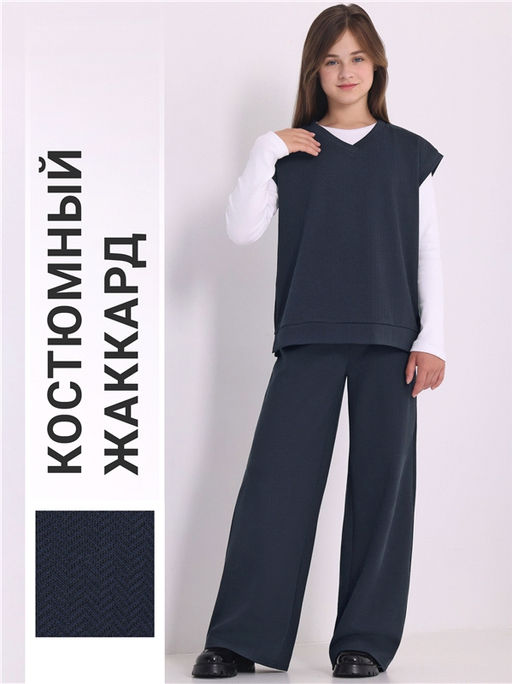 жилет+брюки,хлопок 55% + ПЭ 42% + лайкра 3%,жаккард / хлопок 55% + ПЭ 42% + лайкра 3%,- / твид черный+темно-синий / - / - / - / -,Комплект для девочки из жилета и брюк выполнен из плотного полотна с рельефным рисунком, выполненным с применением жаккардового плетения. Жилет прямого кроя с v-образным вырезом горловины, без карманов и со спущенной линией плеча. Брюки-палаццо без карманов на удобном эластичном поясе. Отличный вариант для школы и не только!Уход: только машинная стирка(руками не стирать!) при температуре 40 градусов, без предварительного замачивания. Ассортимент осенне-зимнего периода.