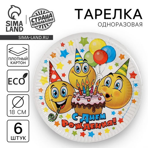 Тарелка одноразовая бумажная «С днем рождения», набор 6 шт., 18 см