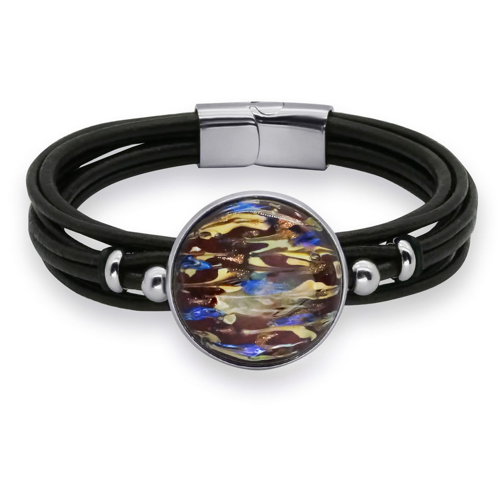 Браслет изготовлен из муранского стекла, натуральной кожи и гипоаллергенной ювелирной стали, что очень важно для людей с чувствительной кожей. Металл не темнеет и не подвергается воздействиям окружающей среды, надолго обеспечивая красивый внешний вид изделия. Крепкий магнитный замок с двойной защитой надежно фиксируется на запястье. Ширина браслета - 1,5 см. Диаметр стеклянного элемента - 2 см. Вес - 22 гр.