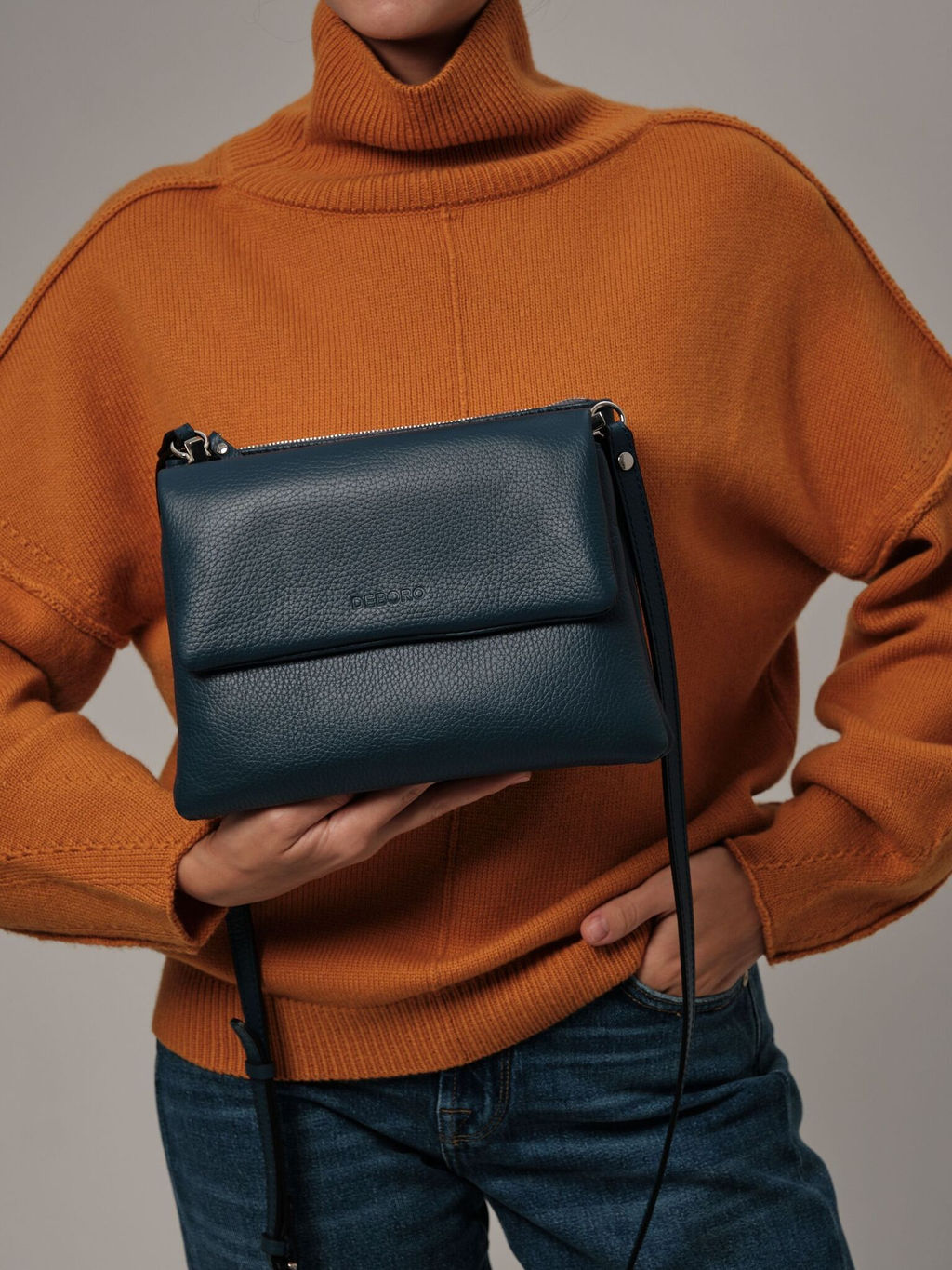 Стильная и практичная женская сумка кросс боди из натуральной кожи Deboro 31069 черный станет незаменимым аксессуаром для активной городской жизни и подходит для различных случаев. Сумка среднего размера, что позволяет удобно разместить в ней все необходимые вещи, не перегружая при этом образ. Она отличается высоким качеством материалов, которые обеспечивают длительный срок службы и сохраняют первоначальный вид даже после длительной эксплуатации. Сумка на плечо имеет удобный съемный регулируемый ремень - стропу, от 86 см до 140 см, который позволяет носить ее как на плече, так и кросс-боди. Это позволяет легко адаптировать сумку под ваш стиль и настроение. Без ремня сумку можно носить как клатч. Элегантный и простой дизайн делает ее идеальной для сочетания с различными нарядами, будь то повседневный или более формальный стиль. Детали: натуральная кожа, 2 отделения с клапаном на магните и на молнии, скрытый карман между отделениями, съемный плечевой регулируемый ремень, внутренний карман на молнии. -- Характеристики -- Цвет: синий Материал: Натуральная кожа Бренд: Deboro Тип: Сумка на плечо Страна-изготовитель: Россия Высота, см: 29 Ширина, см: 32 Глубина, см: 10 Материал подкладки: Хлопок Количество внутренних отделений: 2 Формат А4: не вмещает Высота ручек, см: 22 Длина плечевого ремня, см: 113 Вес товара, г: 450 Ручки: На плечо;Плечевой ремень Пол: женская коллекция Группа товара: Сумки
