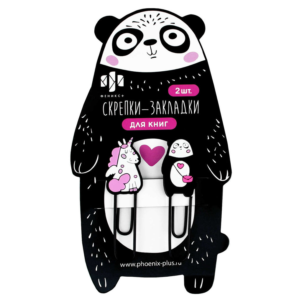 Скрепки-закладки для книг, арт. 71038 / 48 ПАНДА И ЕДИНОРОГ (2 шт. в наборе, размер: 19х63; 18х62 мм, материал: металл, ПВХ; цвет: чёрный, малиновый, белый; особенности: наконечник фигурный из ПВХ, ПВХ-оплётка; индивидуальная упаковка: подложка с европодвесом из мелованного картона + ПЭТ-пакет)