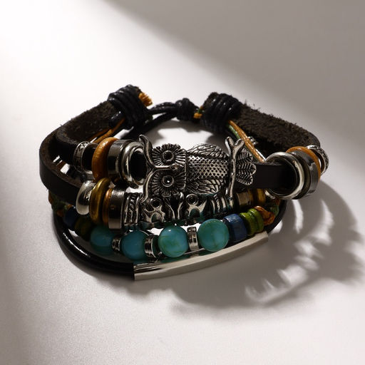 Браслет кожаный «Сова и ряд бусин», d=9 см, чёрный