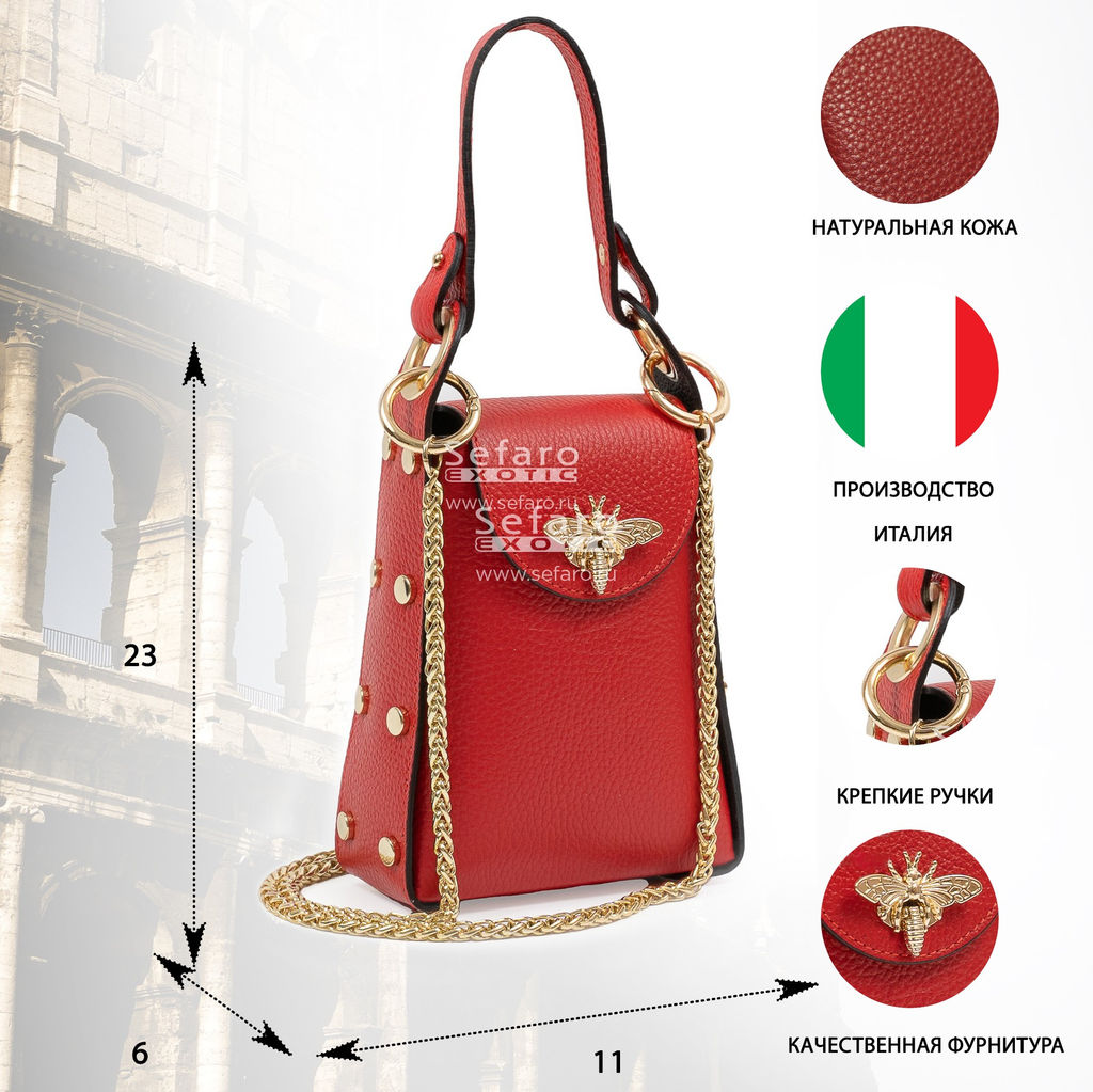 Особенности сумки: замок в виде золотой бабочки, плечевой ремень-цепочка, а также заклепки на боковых стенках сумки - фурнитура высокого итальянского качества. Все эти элементы непременно привлекут к вам внимание окружающих своей яркостью и оригинальностью исполнения.