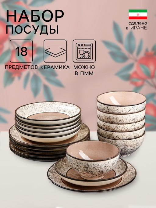 • Набор посуды Керамика ручной работы «Восточный», 18 предметов, бежевый, Иран