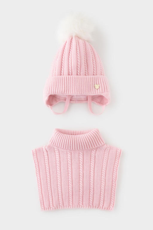 Комплект для девочки: шапка и манишка из полушерстяной пряжи. Шапка на завязках с синтепоновым утеплителем. Подклад из натурального хлопка. Полностью закрывает голову, уши и шею, защищая ребёнка от холодного воздуха и ветра. На макушке помпон. Манишка с высоким воротником с эластичным отворотом.. Состав: шапка: 70% акрил, 30% шерсть; подклад: 100% хлопок; утеплитель: 100% полиэстер; манишка: 70% акрил, 30% шерсть