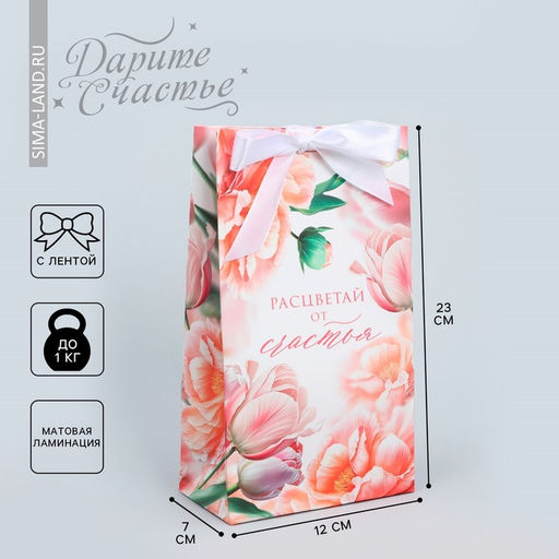 • Пакет подарочный с лентой, упаковка, «Расцветай от счастья», 13 х 23 х 7 см