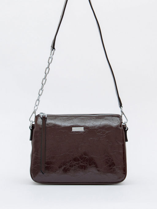 Сумка кросс-боди, выполнена из экокожи. Дополнена серебристой фурнитурой. Данная модель закрывается на молнию. Каркас полужесткий. Носится  через плечо или на плече. В комплекте имеется съемный ремень с регулировкой длины и удлиненная ручка.