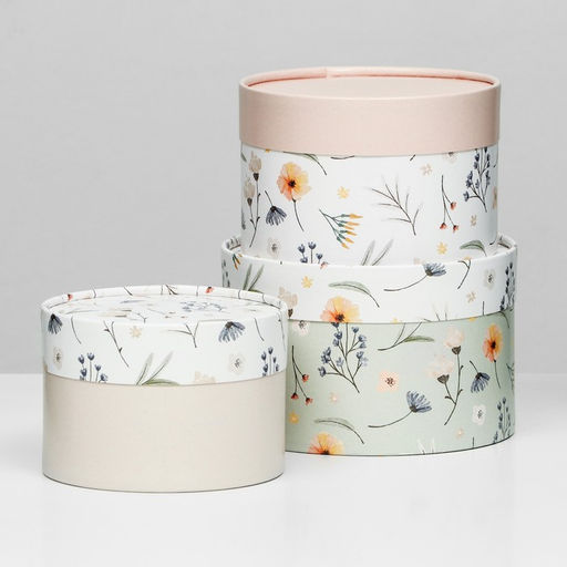 Форма: Круглая. Количество вложений в наборе: 3 в 1. Длина большей коробки, см: 10. Высота большей коробки, см: 16. Тематика: Цветочно-растительная. Тематика праздника: Универсальная. Примечание: Размеры всех коробок в описании..