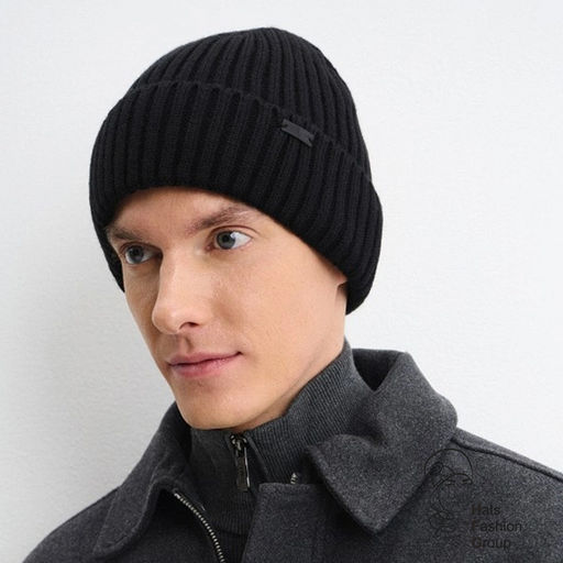 Теплая мужская шапка по голове. Шапка с отворотом, выполнена из полушерстяной пряжи, утеплена флисом. Вязка резинкой 2х2 придает дополнительный объем изделию. Сбоку шапка украшена фирменной кожаной шильдой. Длина изделия - 22 см, отворот - 8 см.­