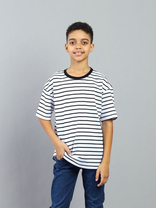 Футболка для мальчика оверсайз из кулирной глади. Рукав втачной, горловина обработана притачной бейкой из рибаны с лайкрой. Перед  декорирован принтом.