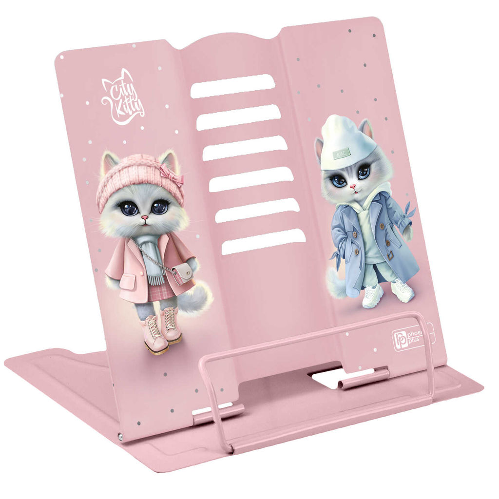 Подставка для книг и учебников Феникс+, арт.69347/ 24 ГОРОДСКИЕ КОШЕЧКИ (19х20х15.5 см, окрашенный чёрный металл, количество углов наклона: шесть, прижим для фиксации страниц: есть, УФ-печать, ПЭТ-пакет).